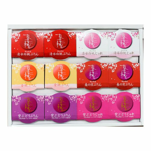 「おかやま桃子」シリーズから12個入のアソートギフトです。 岡山県産清水白桃を使った、「清水白桃ぷりん」「清水白桃じゅれ」 岡山県産金桃を使った「金桃ぷりん」 岡山県産ニューピオーネを使った、「紫ぶどうぷりん」「紫ぶどうじゅれ」、 岡山県白石島産桑の実を使った、「桑の実ぷりん」。それぞれ果物のピューレや果汁をたっぷりと使用して、 果実本来の味わいを大切に仕上げました。 手土産や贈答にぜひご利用ください。