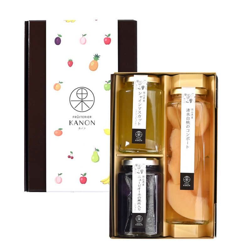 フルーツコンポート200g(清水白桃)、フルーツジュレ110g(ニューピオーネ)、コンフィチュール125g(シャインマスカット)