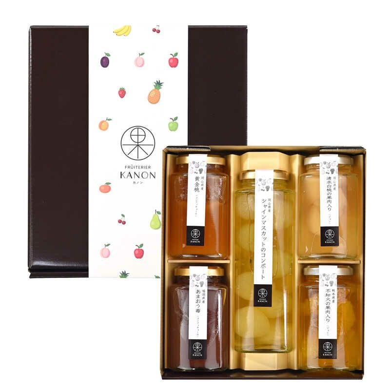 フルーツコンポート200g(シャインマスカット)、フルーツジュレ110g(清水白桃、不知火)、コンフィチュール125g(黄金桃、あまおう)