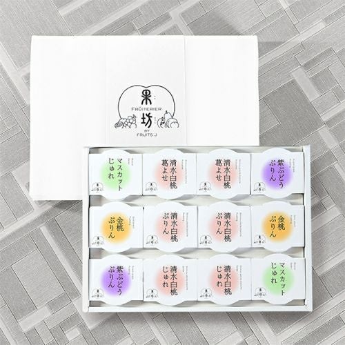 岡山の名産「清水白桃」「マスカット」「金桃」「ニューピオーネ」をそれぞれ食べきりサイズのぷりん・じゅれ・葛よせにしたプチデザートの詰合せ。